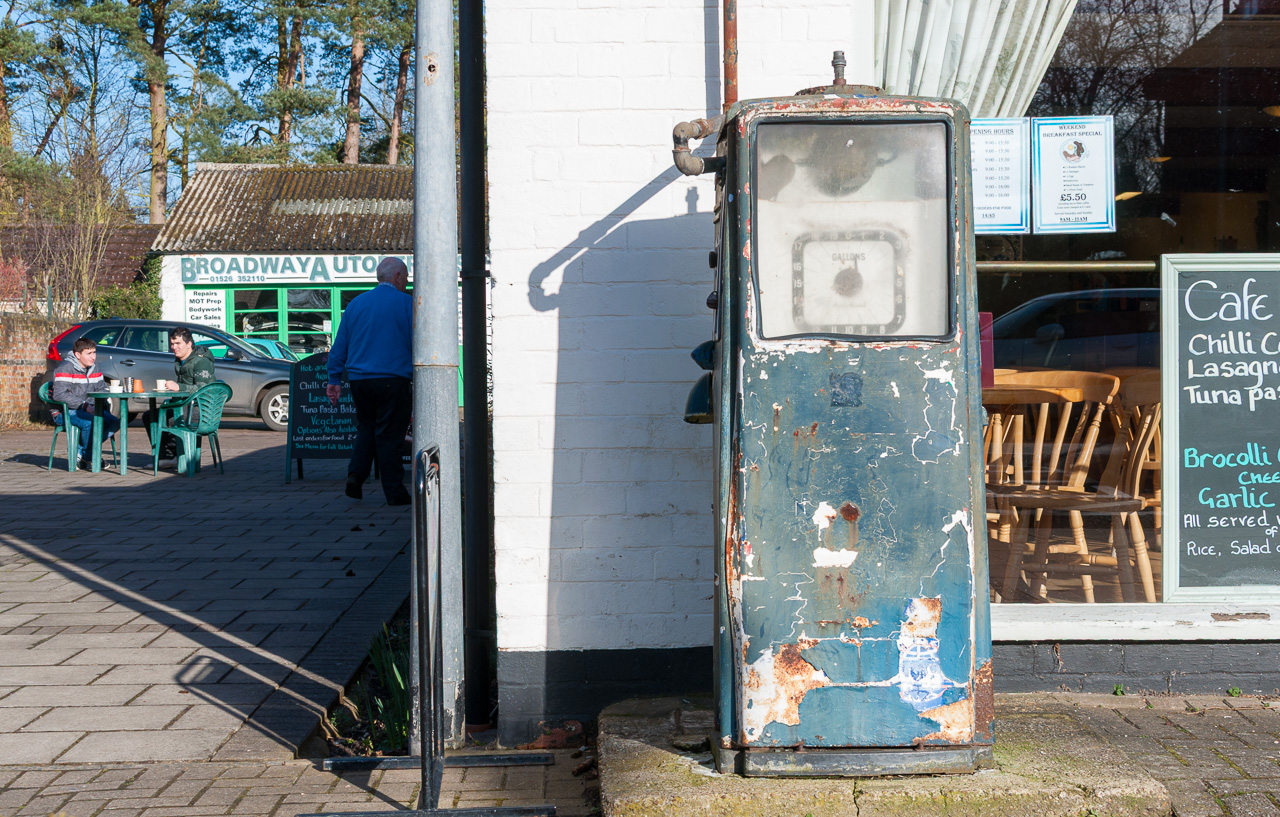 Disused Lincolnshire garage with old fashioned petrol pump