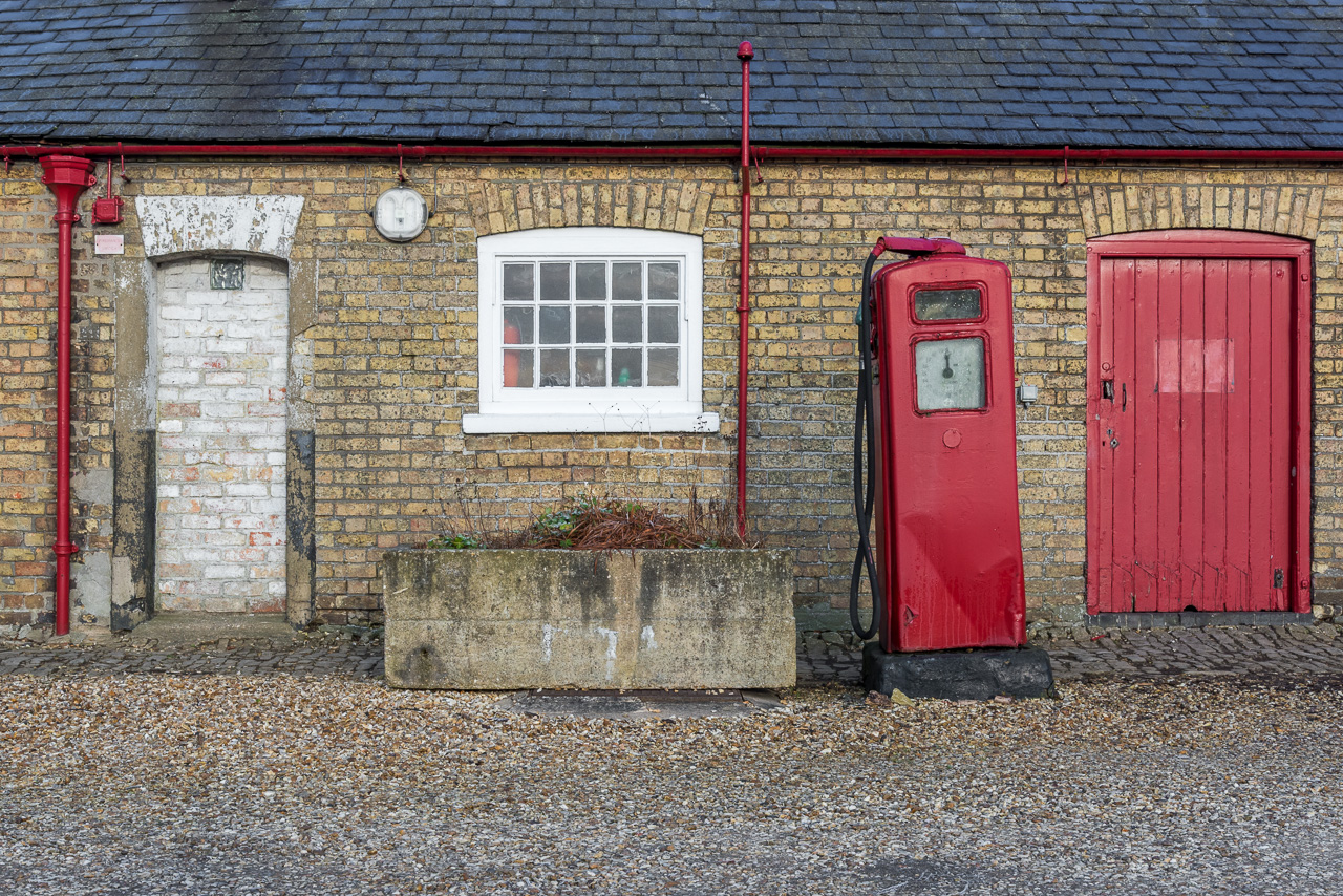 Disused Lincolnshire garage with old fashioned petrol pump