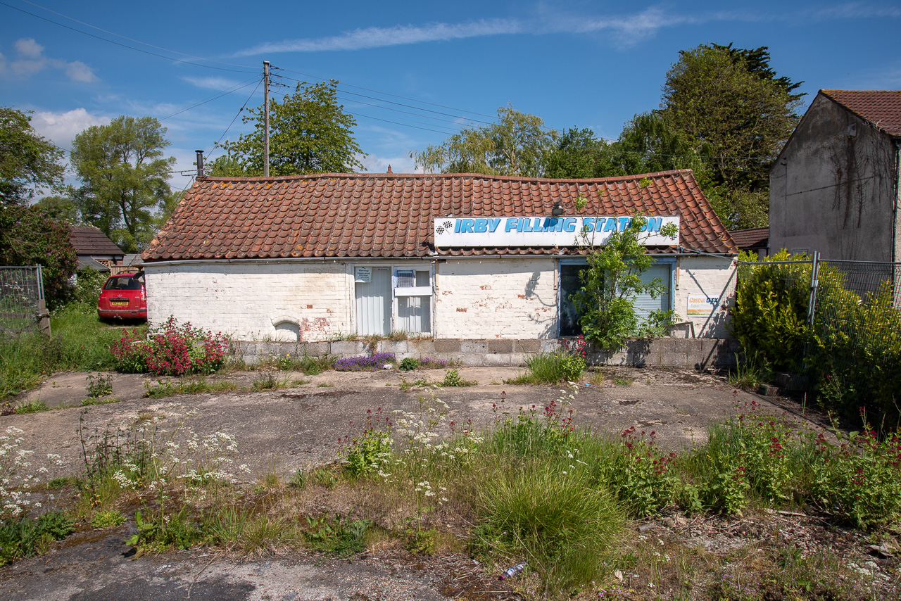 Disused Lincolnshire garage with sign that reads Irby Filling Station