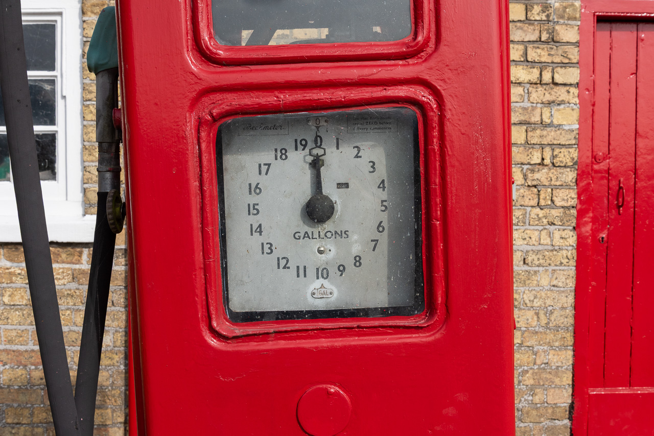 Old fashioned petrol pump clue up detail of measurement face