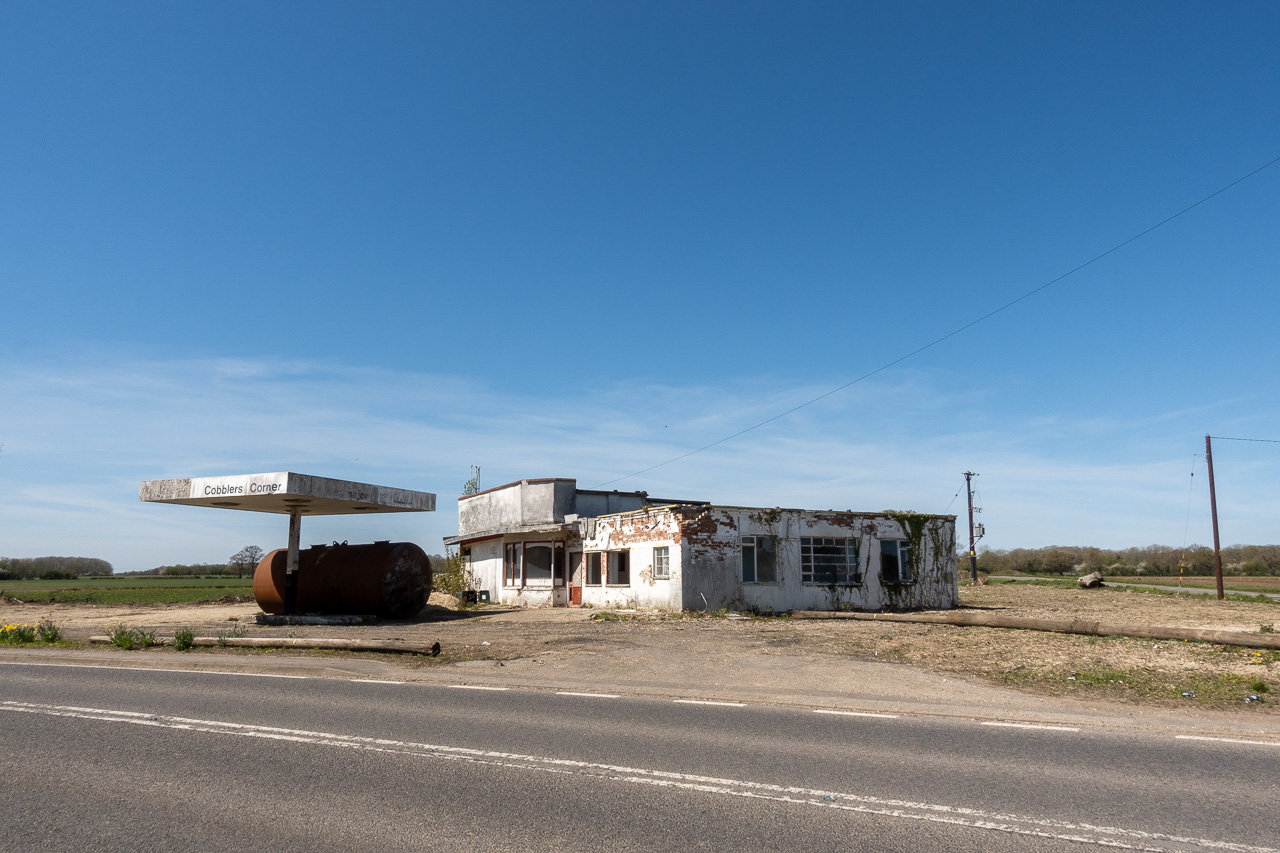 Abandoned Lincolnshire garage in desolate landscape with large blue sky